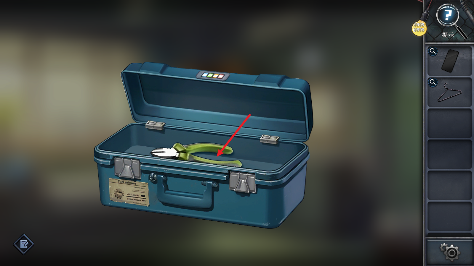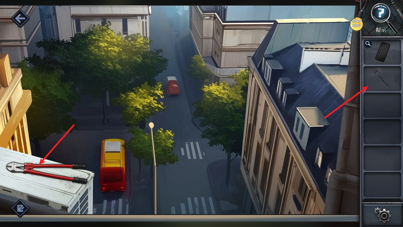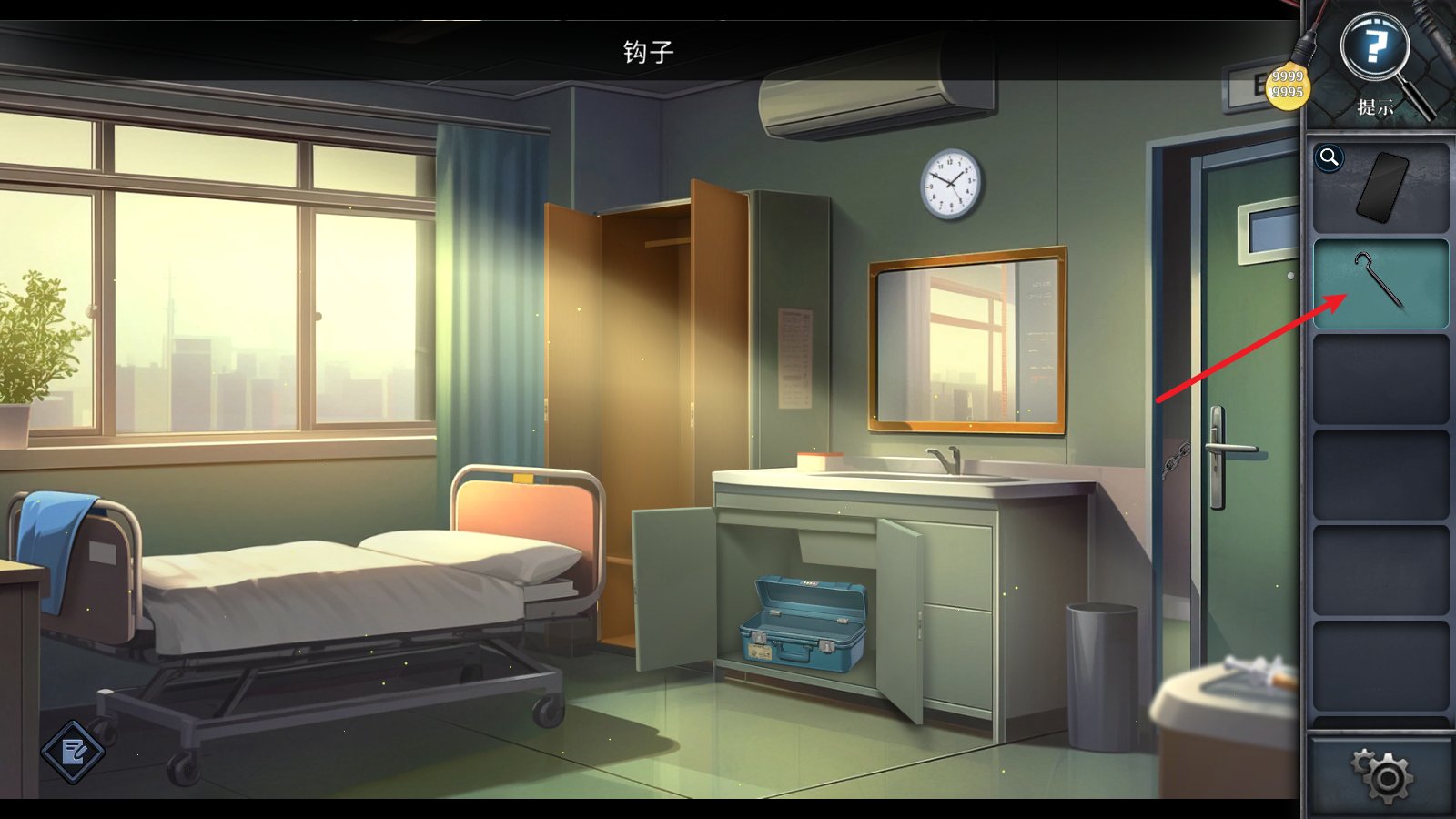 点击窗户,可以利用钩子将窗户外的大钳子钩进来。