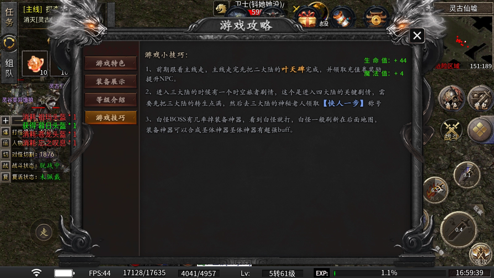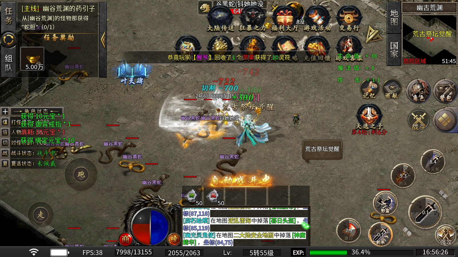 白怪BOSS有几率掉落装备神器,遇到白怪就打,它们通常刷新在后面的地图。装备神器能合成圣体神器,圣体神器带有超强buff。