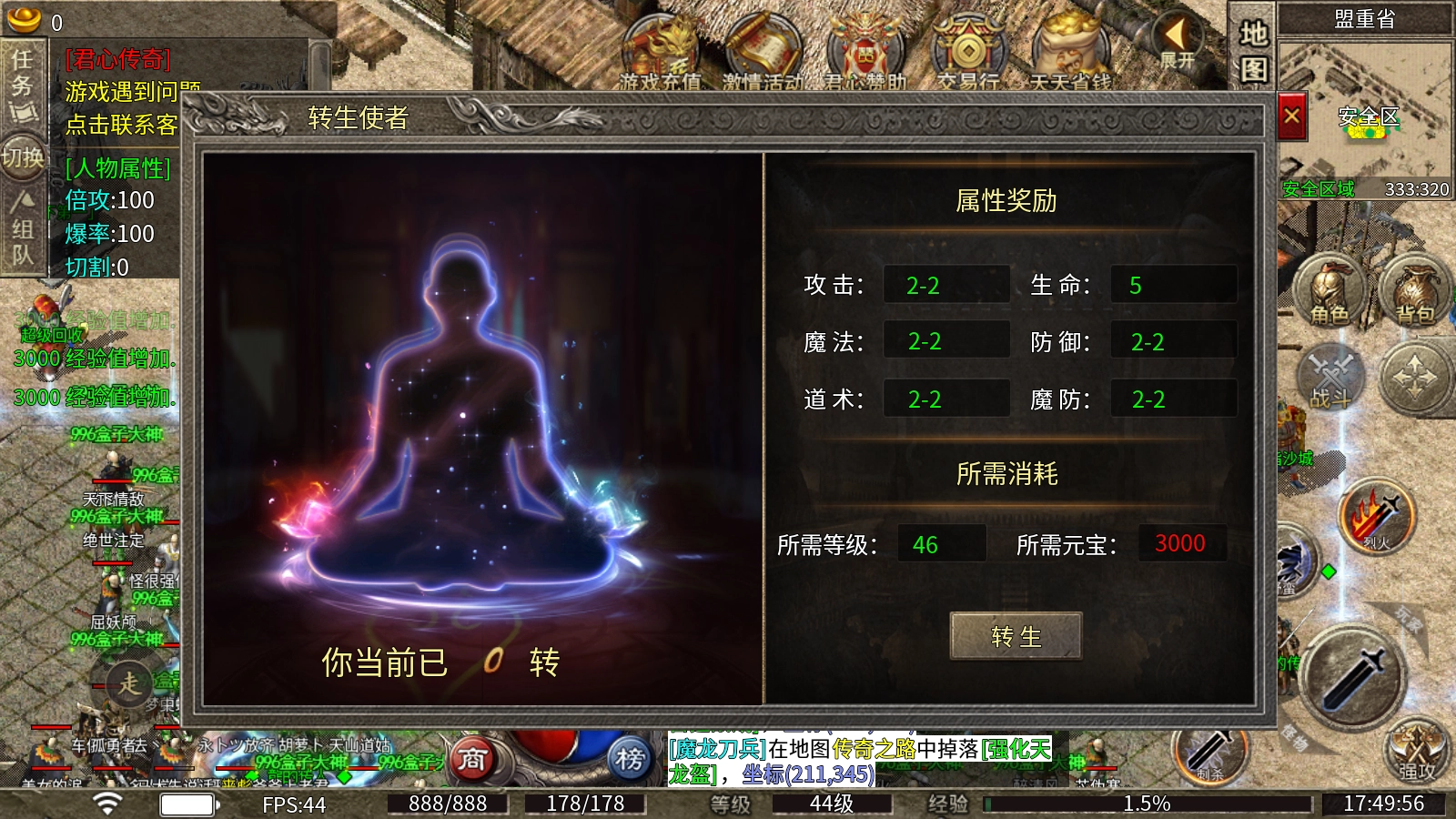 人物转生系统:玩家需达到46级方可解锁该功能,通过消耗元宝完成转生操作后,可大幅提升角色的攻击、魔法、道术属性,同时增强防御能力。