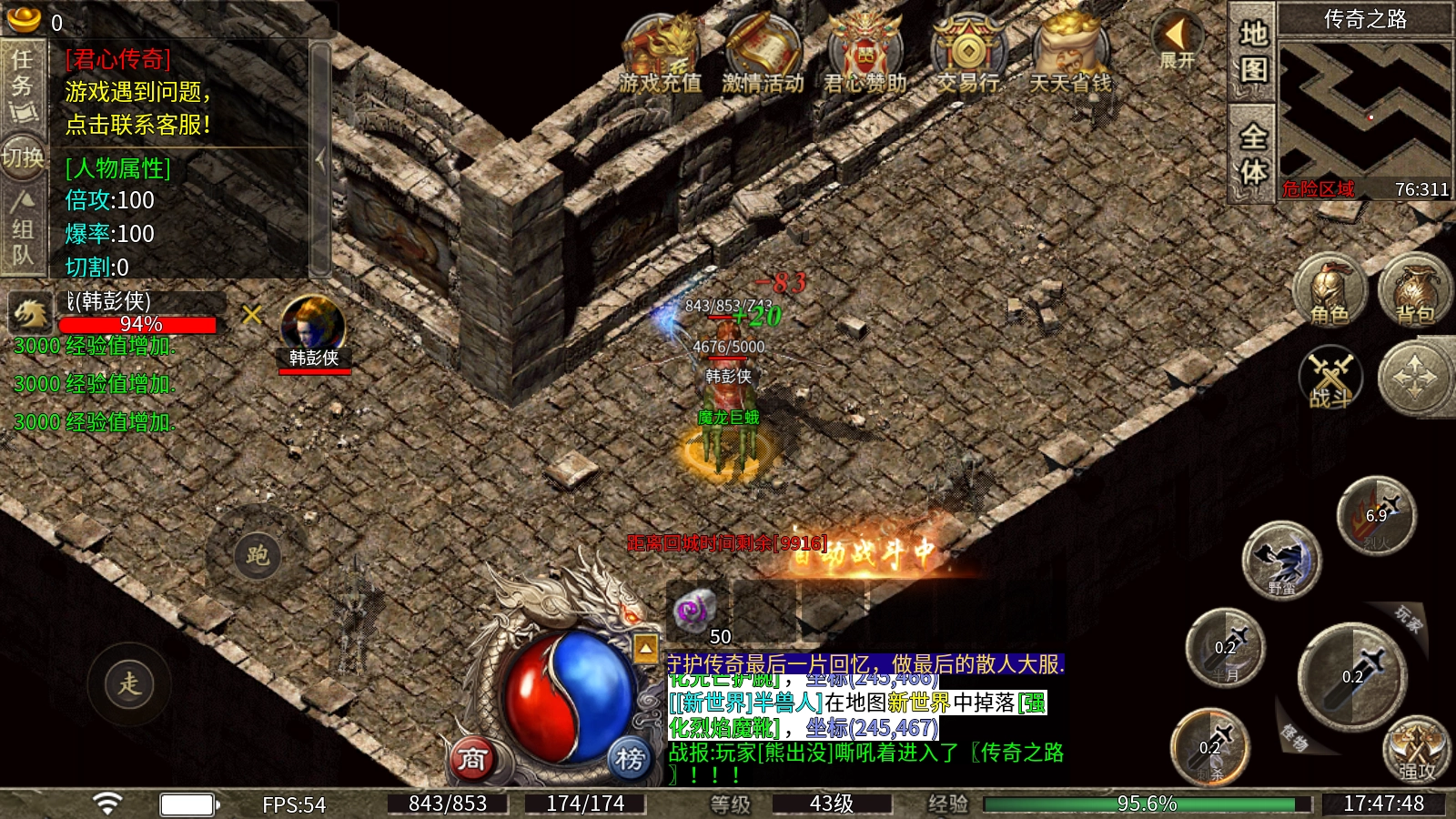 君心传奇推出180特色火龙三职业版本,在保留经典玩法的基础上,新增魂骨系统、装备熔炼等创新内容,为你带来截然不同的热血体验!经典的战士、法师、道士三大职业可供选择,每种职业都有独特玩法与体验,让你领略多元化的传奇魅力!本服所有装备均可通过打怪获取,小怪也能掉落顶级物品,爆率极高且人气稳定!在这里,人人都有机会实现传奇梦想,只要投入时间就能完成逆袭!