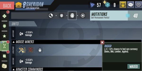 ● DNA 优先:先把矿工老鼠的第一个技能升到10%产出(涵盖DNA、苹果、木头、金币),等这个升级完成后,再去升级背包老鼠。