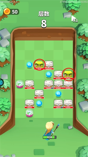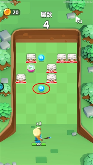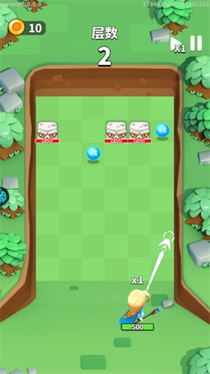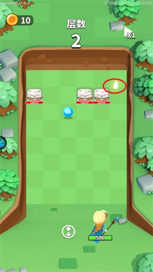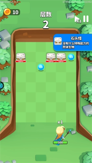 长按屏幕会显示弹球的运动轨迹,既能直接对准石头怪发起攻击,也能借助地形让弹球多次弹射以调整角度或路径。