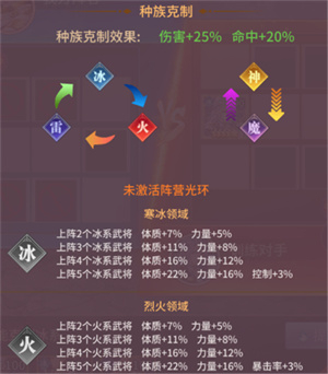 武将共划分为冰、火、雷、神、魔五个系别,不同系别的武将只要达成光环条件,就能得到对应的属性光环加成,从而在战斗里实现属性的提升。