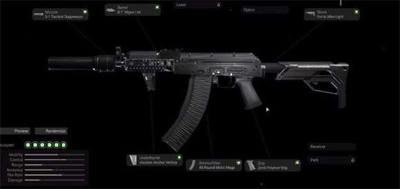 AK系列里这套配置被很多人推荐,既稳又灵活。枪口选BS1,枪管选8.1vityaz,枪托用Fortis Light,前握把配scales,子弹选45round,后握把装zenit。