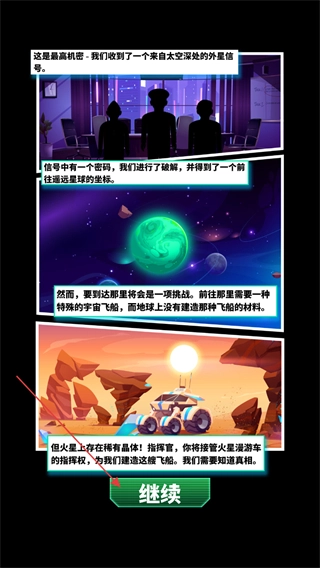 游戏开局会以动画形式呈现剧情:玩家将了解到需要前往遥远星球,但目前缺少建造飞船的材料;而火星上存在一种稀有晶体,为了获取它,玩家需要接管火星漫游车的指挥权。点击“继续”按钮后,即可正式进入游戏环节。