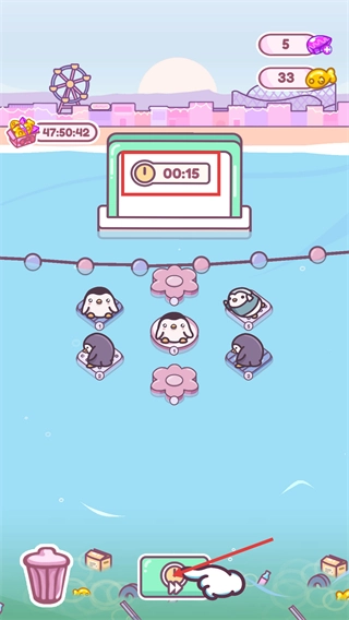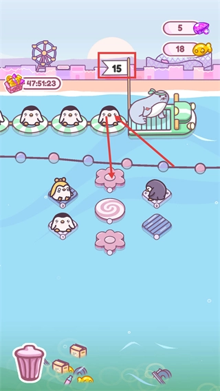 把对应企鹅拖放到标有【花朵】的位置来完成匹配,这样就能推进【15】号关卡的进度,还能积累上方的金币资源以提高收益。