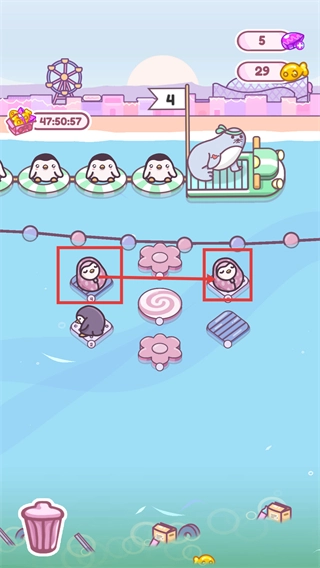 把相同样式的企鹅拖放到同一个区域进行合并,以此推进【4】号关卡的进程,还能提高金币获取的效率。