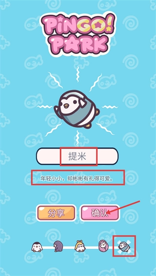 在【PINGO-PARK】里熟悉角色【提米】的设定后,点击【确认】按钮就能继续推动剧情,解锁新的企鹅角色。