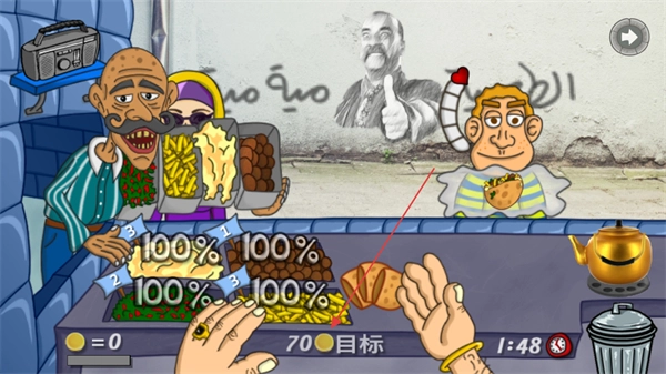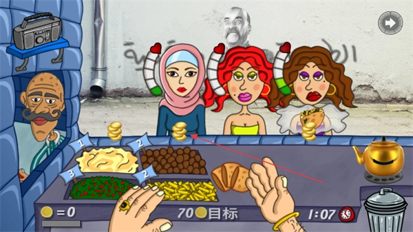 把挑选好的食材搭配成法拉费,送到对应的顾客手中,目前需要完成的数量目标是70个。
