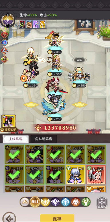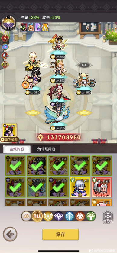 先从简单的说起,比如阵型。我这套阵型绝对是这个游戏里最强的。为什么这么说呢?因为速度是这个游戏里最关键的属性,先手出击的优势实在太大了。我把那些强力角色四个排成一排,再搭配上宠物黑兔子——它的3星技能能给同排角色增加10%的速度,这样就能一下子超过对面的速度,赢的概率自然就高了。