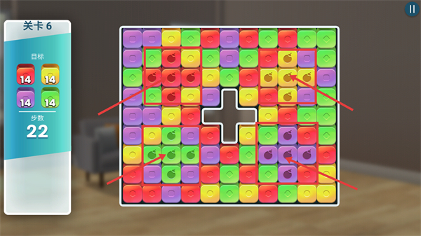 2、在【关卡6】中,需收集红、黄、紫、绿四种颜色各【14】个,建议借助【22-步数】的机制,优先消除同色方块以加快进度推进。