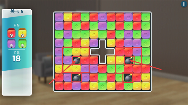 3、当剩余步数为【18】时,使用炸弹道具来加快消除速度,以达成四种颜色各收集【9】个的目标。
