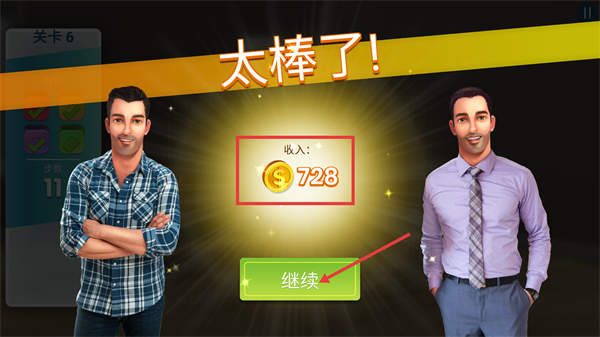4、通关后获得【收入-728】金币,点击【继续】按钮,即可开启下一关消除挑战,积累更多金币。