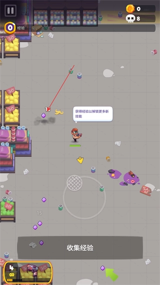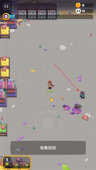 3、被击杀的僵尸会掉落经验石,拾取后能够提升上方的经验条。