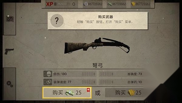 1、在正式进入地图关卡之前,我们先去购买装备,以此强化自身实力。请轻触“购买”按钮,打开“购买”菜单来选购武器。