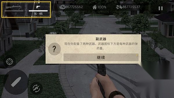 8、可以看到,我们当前的装备正是刚才配备的那两种武器,每种武器的图标下方显示着对应的弹药量。