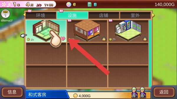 画面呈现设施建造界面,玩家能够选择建造和式客房之类的设施,界面下方标注着和式客房的售价为4000G。