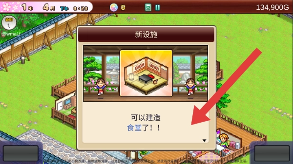 3、弹出新设施提示,告知玩家食堂已可建造,画面展示的是游戏里解锁新建筑设施的界面。