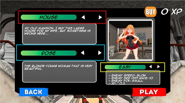 1、进入恐怖的妻子游戏,界面中红框标注的“house”按钮可切换场景地图,黄框的“easy”按钮能调整游戏难度,蓝框的“rose”按钮可更换妻子的不同形象;完成这些设定后,点击“PLAY”即可开始游戏。