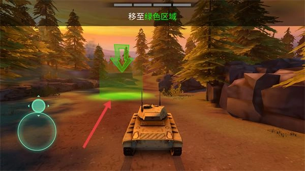 1、进入关卡后,按照“移至绿色区域”的提示,借助左侧摇杆操控坦克移动,朝着画面里的绿色目标区域行进。