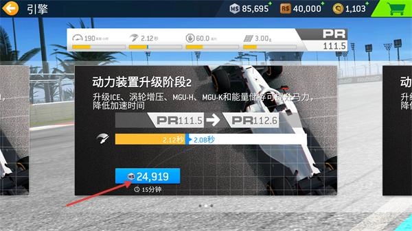 1、在引擎升级界面选择【动力装置升级阶段2】,花费【€24,919】开启升级,以此减少研发所需的时间。