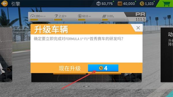 3、弹出确认框后点击【现在升级】,消耗对应道具即可立即完成【FORMULA1-F1·首秀赛车】的研发流程。