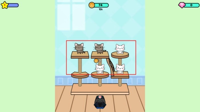 3、把两只同品种的猫咪拖到一块儿,它们就会自动合成更高级的猫咪。像白猫能合成灰猫,灰猫能进阶成花猫,解锁的猫咪品种越多,能拿到的奖励就越丰厚!