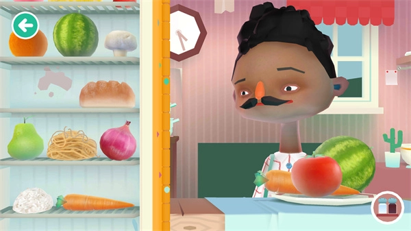 2、左侧摆放着一台冰箱,里面存放着丰富多样的食材,像西红柿、胡萝卜这类常见的都有,你可以把它们拖动到客人面前的盘子里。