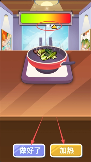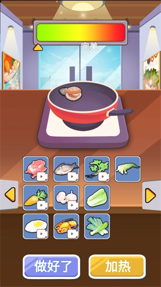 8、长按右下角的加热按钮来调节火候,留意屏幕上方的“完美”指针,尽可能让指针停在完美区域以达到最佳效果,操作完成后点击“做好了”提交菜品。