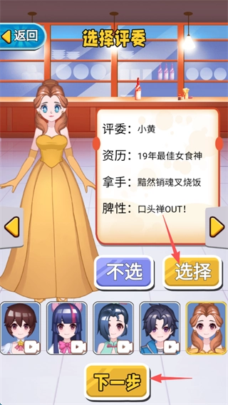 5、选好评委后,点击右侧的“选择”按钮完成确认,接着点击“下一步”推进烹饪流程。