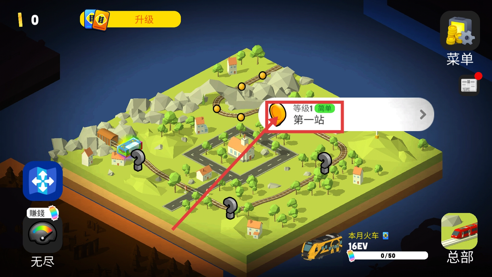 1、点击【等级1-简单-第一站】进入关卡,开启火车运输乘客的挑战。你可以先查看升级和菜单功能,熟悉界面后再开始挑战。