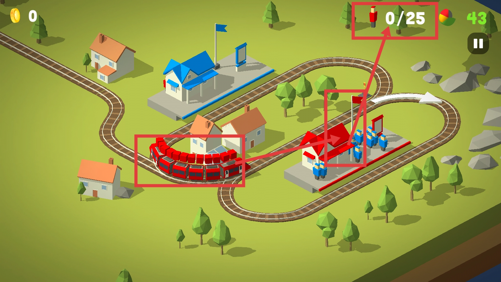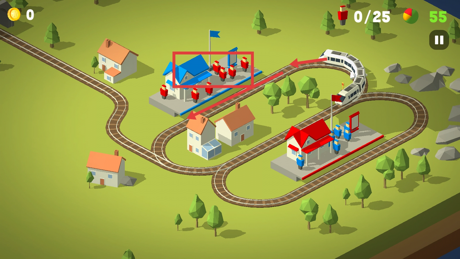 3、切换至红色火车,前往对应的车站,留意【0/25】的乘客数量,完成运输任务以推进关卡进度。