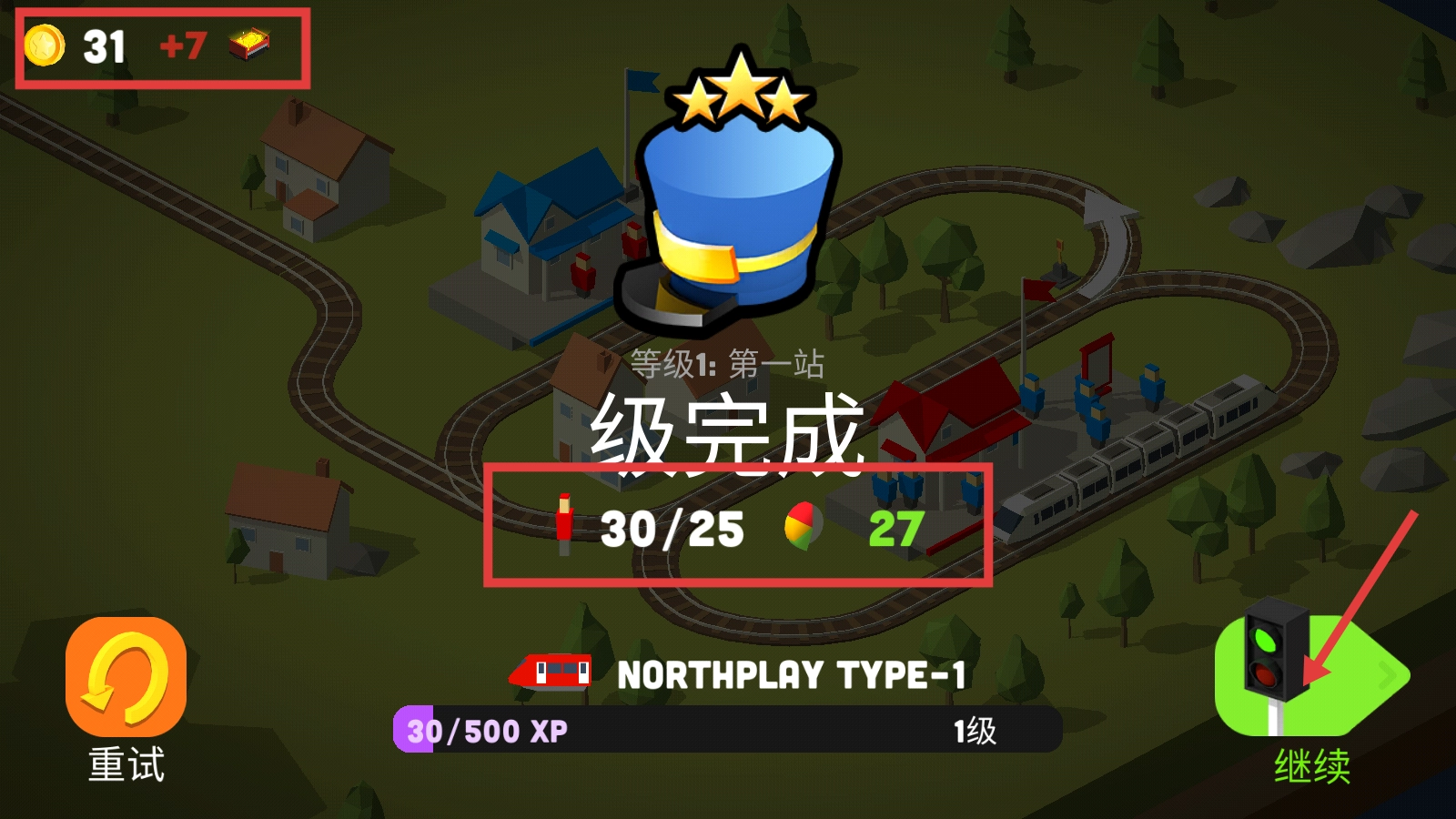 4、完成关卡后,可获得【金币31+7】等奖励,点击【继续】按钮进入下一关,积累资源用于火车升级或新关卡解锁。