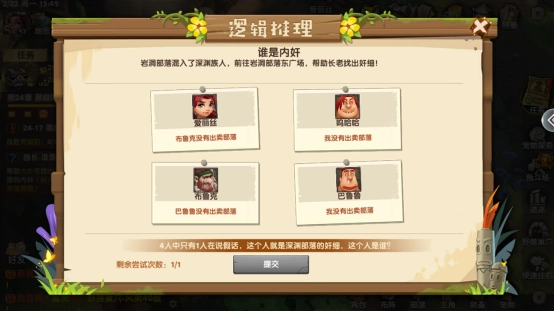 答题也是有小技巧的,4个人里只有一人在说谎,所以观点一致的回答肯定是正确的。就像图中这种情况,布鲁克和巴鲁鲁都觉得巴鲁鲁没有出卖部落,那我们就能先排除两个错误选项。接下来只要分析爱丽丝和呜哈哈的说法就行。爱丽丝认为布鲁克是好人,既然我们已经确定布鲁克是好人了,那叛徒自然就是呜哈哈了。