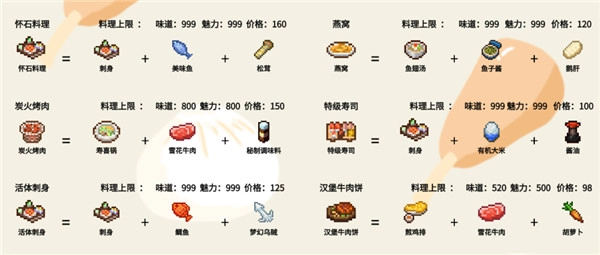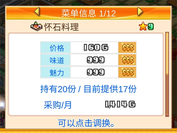 3、菜品价格由八维图的数值直接决定,每种食物都有对应的价格、味道和魅力上限,所以在菜品研发时,优先选择上限高的菜品,通常能收获事半功倍的成效!
