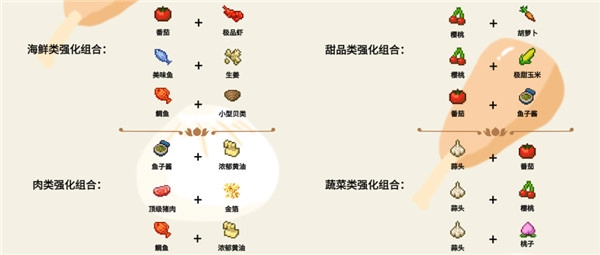 5、每道菜品依据自身的风味特点和所属品类,都存在与之适配度最高的强化食材,这部分内容需要靠日常的经验积累去自行探寻,此处仅能列举一些较为通用的例子供大家参考。