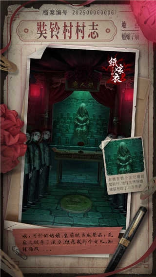纸嫁衣8千子树是一款结合中式民俗与悬疑解谜元素的手机游戏,作为系列第八部作品,延续了前作的神秘风格。本作围绕“重返奘铃村”展开核心剧情,玩家将操控民俗研究者与通灵少女两位角色,利用“因果镜”“生犀香”“纸偶咒”等神秘道具,逐步揭开村庄背后的诡异真相。游戏新增动态婚书系统与五行谜题机制,深度还原中国传统民俗文化,营造出强烈的沉浸式仪式感。紧凑的剧情设计、浓厚的氛围渲染,使其成为国产解谜类游戏中的佳作,尤其适合喜爱中式恐怖与逻辑推理的玩家。