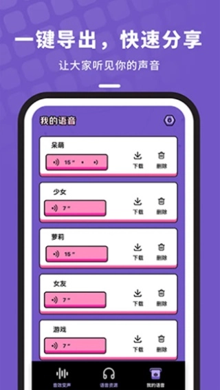 3、音频库功能:无论是变声音频还是原音频,都能一键轻松保存,操作便捷高效;此外,还支持将“我的创作”板块中的音频一键分享给好友。