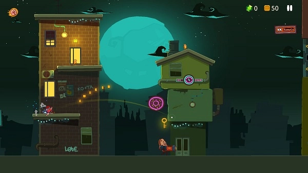 玩家操作起来很简单,一根手指就能搞定。游戏里没有传统的方向键和跳跃键,当你拖动主角时,屏幕上会出现一条抛物线,这时还会触发“子弹时间”效果,周围的一切都会慢下来。等你松开手指,主角就会沿着抛物线的轨迹弹射出去,并且能粘在任何接触到的地方。