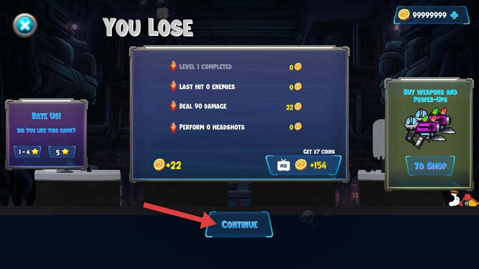 4、战斗失利后,点击【Continue】按钮可继续游戏,重新挑战该关卡。