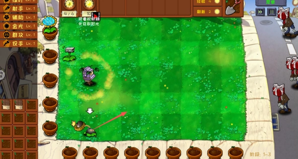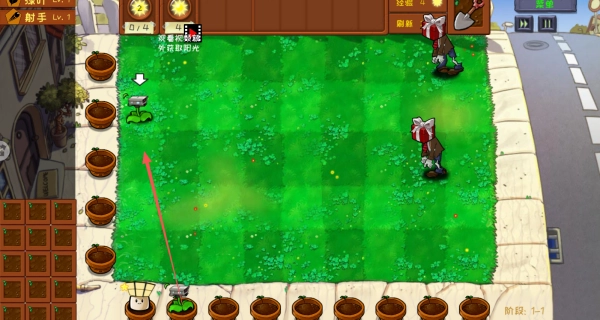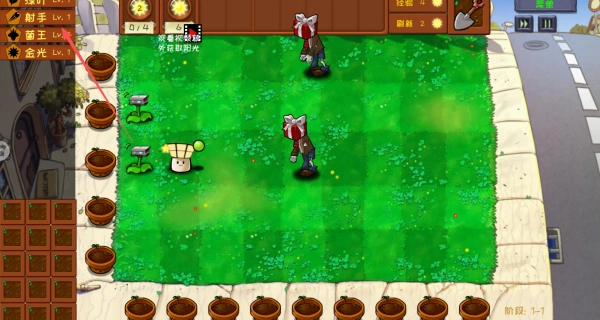 1、游戏开始时,优先在底部的花盆里种植向日葵这类阳光植物,以此积累阳光资源。
