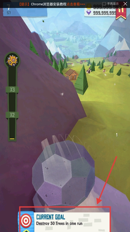 2、当前任务是摧毁50棵树,你需要操控滚石顺着斜坡滚动,瞄准树木密集的区域进行破坏,以此完成目标。