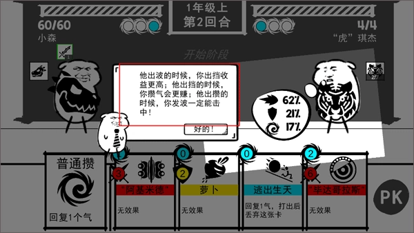 9、现在需要依据对方当前所处的准备阶段来挑选对应的攻击方式,选好卡片后点击“PK”,即可迅速进入PK阶段,争取顺利从小学毕业吧!