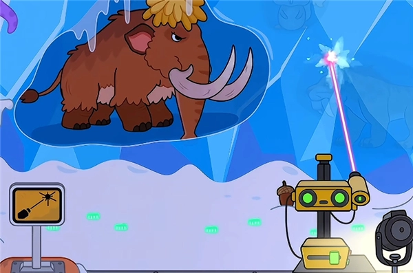 4、比如在这里,小编拖动激光让冰块融化后,就能看到长毛象和小企鹅啦;