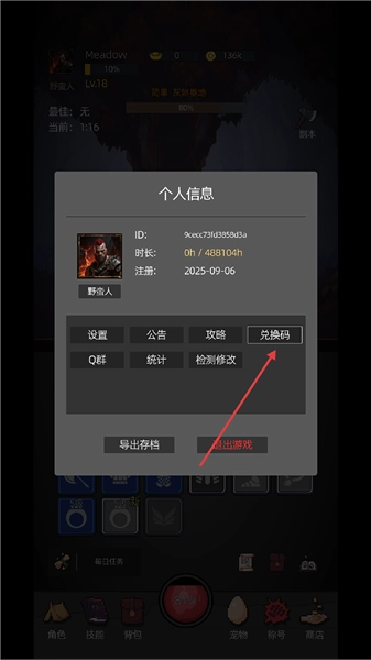 3、进入游戏后先点击角色头像,打开“兑换码”功能,选择“一键补领”,即可领取全部开局奖励。
