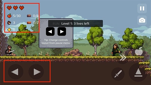 2、进入游戏界面,可看到当前角色属性为1级,拥有三条生命,屏幕左边按钮为左右键,