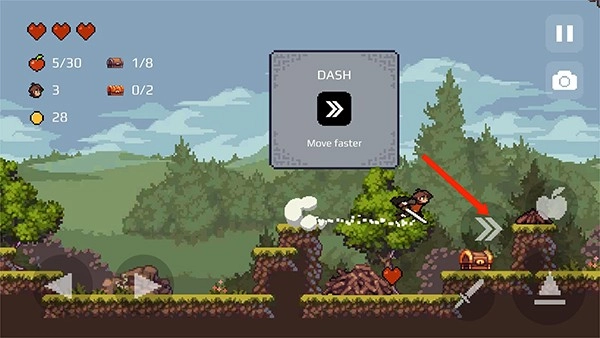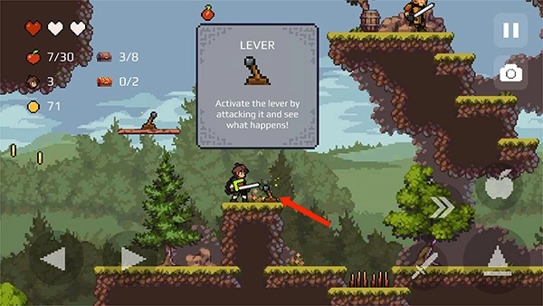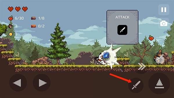 6、左上角为角色的属性栏,包括生命值、苹果数、宝箱数、金币数等,点击右边的【苹果】图标,可使用苹果攻击敌人,同时也会消耗苹果数,需要合理使用,