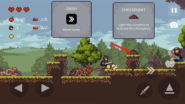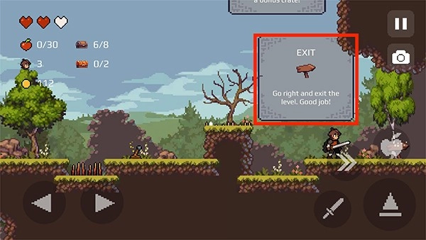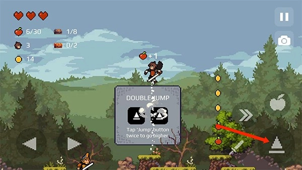 3、和游戏NPC完成对话后继续往前,右下角的【三角形】图标为跳跃键,尝试跳跃去接取图中的苹果,