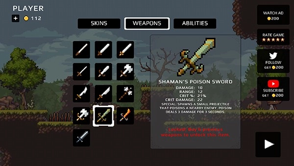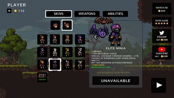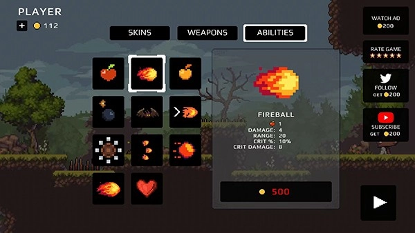 12、游戏中还有各种各样的SKINS人物皮肤、WEAPONS武器、ABILTIES技能等等资源,玩家可以通过不断闯关来解锁使用,以上就是苹果骑士地下城的玩法了。