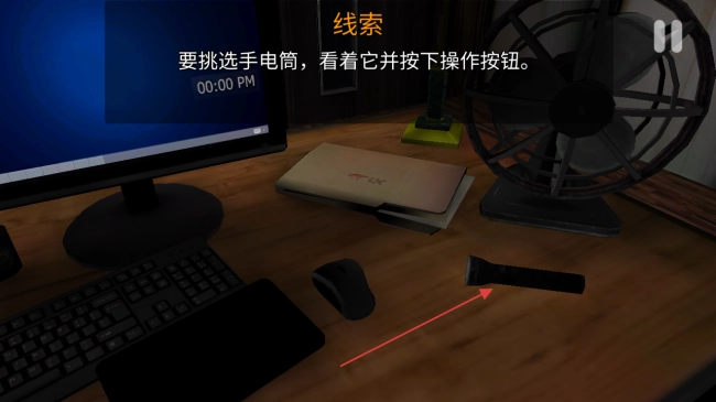 2、根据线索提示,要挑选手电筒,找到桌上的手电筒,看着它并按下操作按钮,获取手电筒道具。